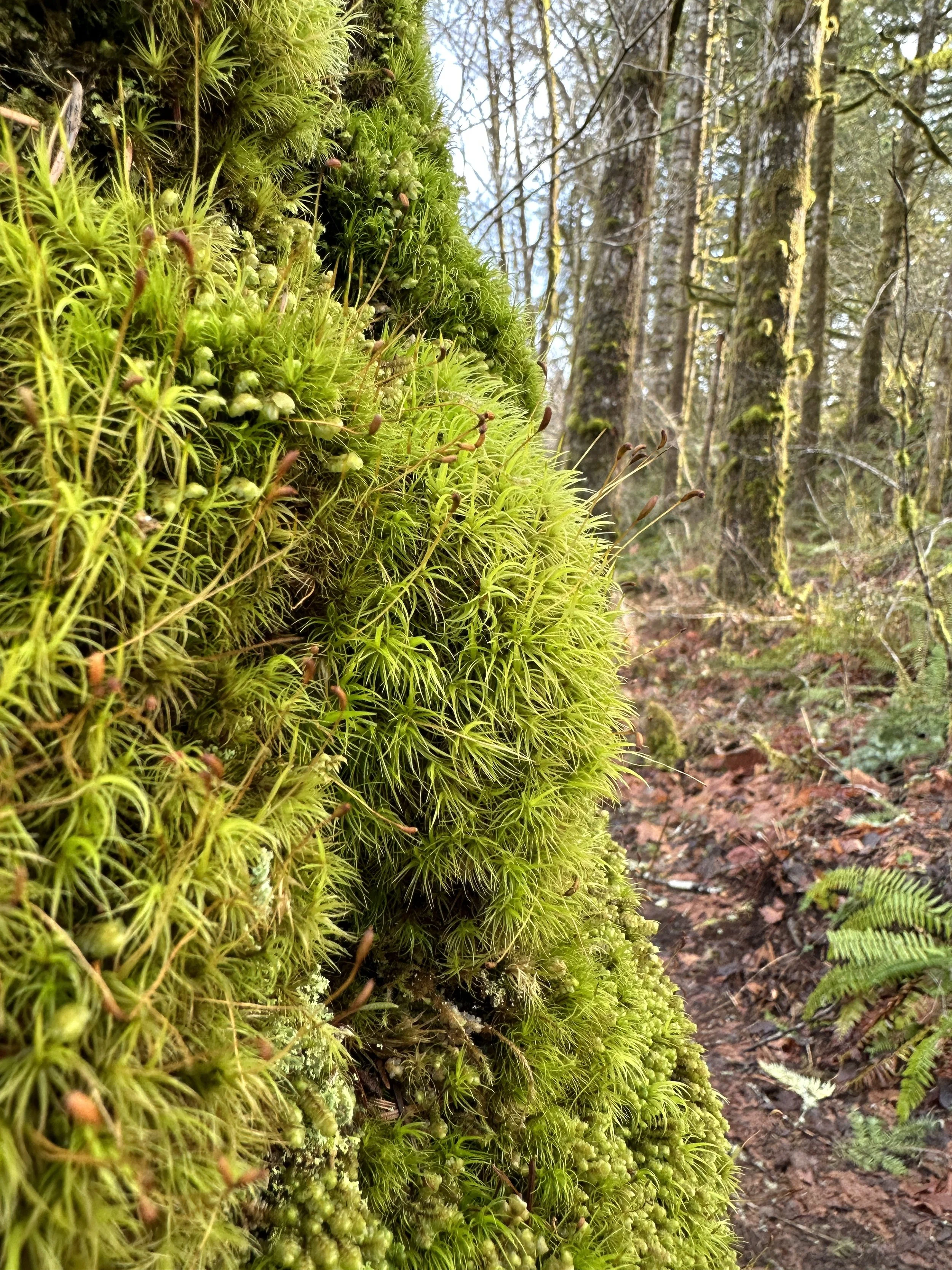 It was a short hike through the first part which was right along the creek, through some big trees. From there, it opened up and I had to cross over some fallen trees. I followed the trail to the railroad tracks, and crossed, but it got a little thick and I didn’t feel like going any further. I turned back and took an alternative route through some bigger trees. The sun was streaming through, it was a gorgeous morning. The moss was illuminated and the ferns were a brilliant green. The area was relatively quiet and I saw no one around.