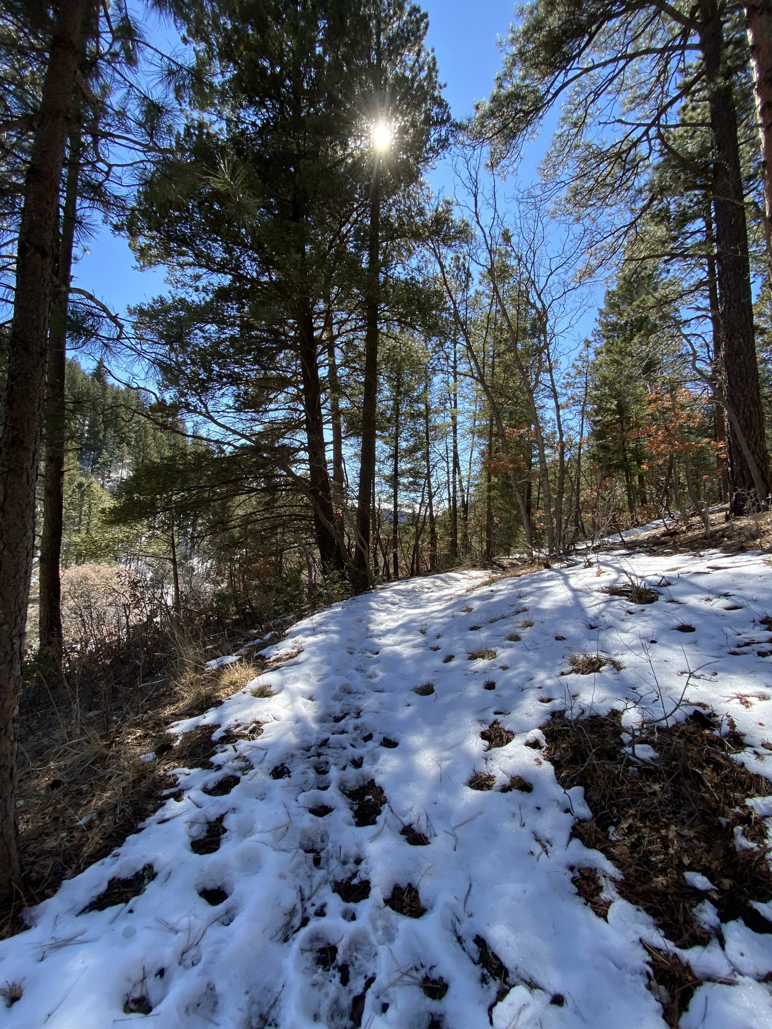 I was in New Mexico for work again, so I decided to take advantage of my surroundings and get a good hike in on a familiar trail. My aunt and I visited this trail last September, but it was completely different this time around. Same great trees and mild incline, but with sparkly bright snow. The snow was not deep enough to require anything more than my hiking boots, but it was prominent enough to fill my heart with joy. I miss regular snow, but apparently only when it’s nice to look at and not deep enough to require snow boots. The trail has a mile slope as it switchbacks along the hillside. It’s at about 8,000 feet, give or take, and follows the highway out of Cloudcroft. There are sweeping views of trees and mountains, but it also feels like a hallway through some big trees. It’s a nice little trail to do if you don’t have all day and want to enjoy some fresh pine scent. It’s not secluded feeling; there is road noise on occasion.