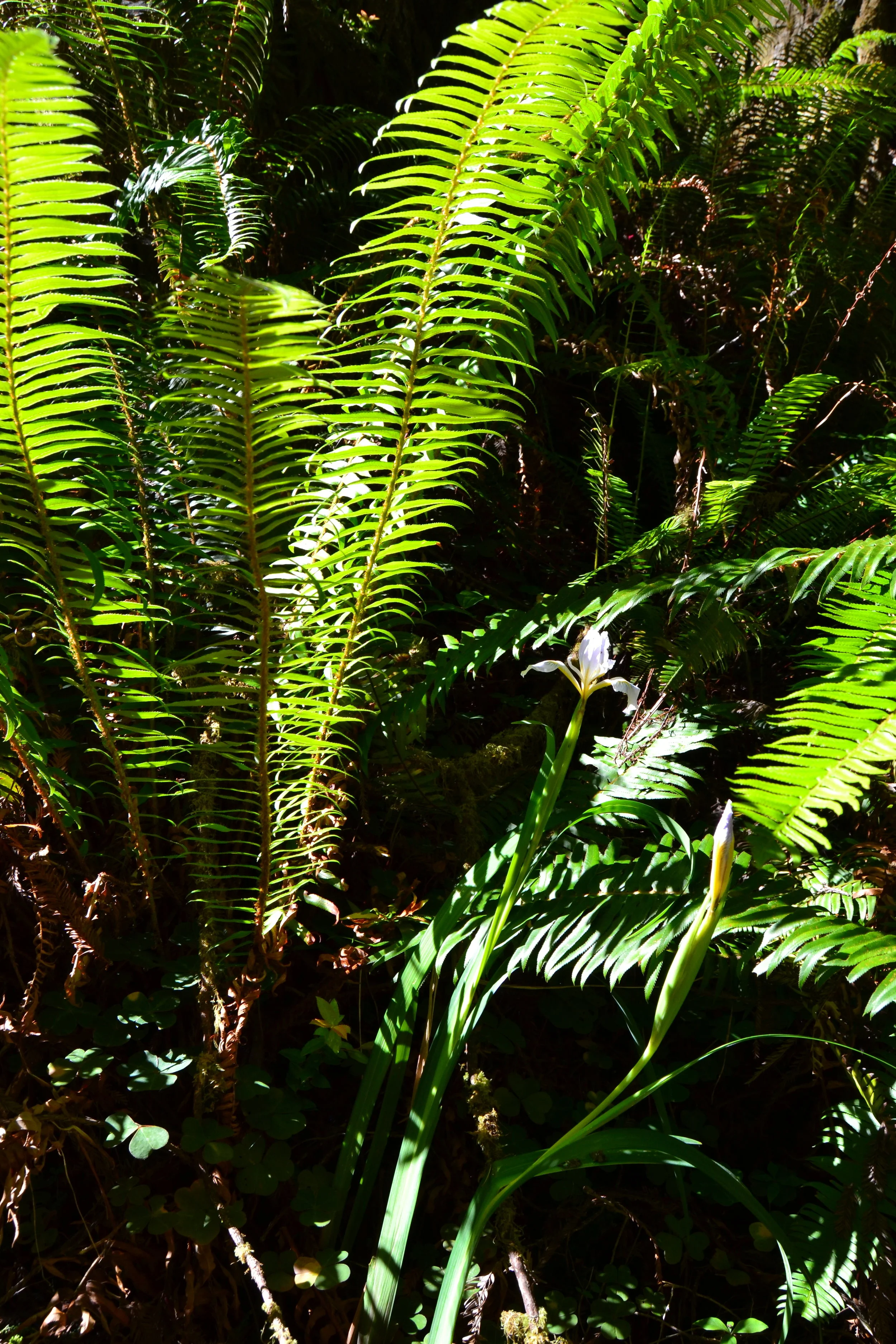 First things first, we posed with several large trees because that’s what you do in the Redwoods. After the photos, we admired how quiet it was in regards to the outside world. It was far enough from the 101, or there were enough trees, that it seemed like it was in the middle of nowhere. I can remember just standing in a patch of sunlight coming in through mossy branches and listening to the creek trickle by. We went back, further and further, finding more solitude as we walked. With the solitude came endless ferns, a few white iris flowers, and honeysuckle. The ground was a brilliant green as far as you could see, with the creek barely visible along the trail.