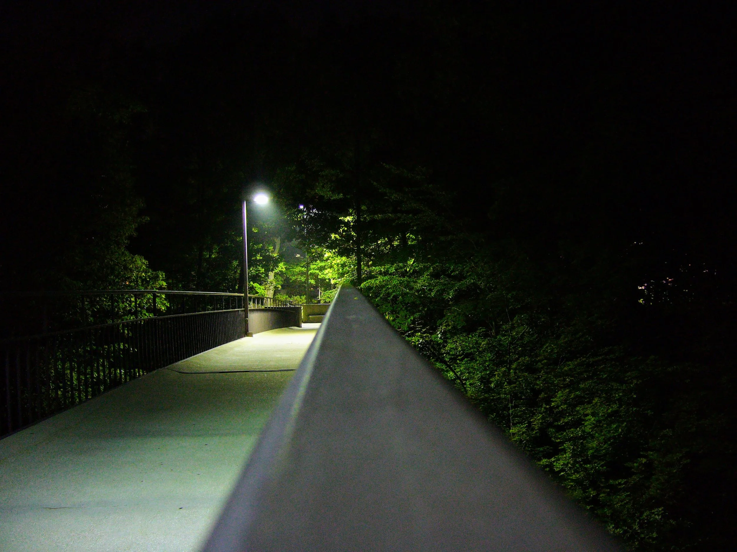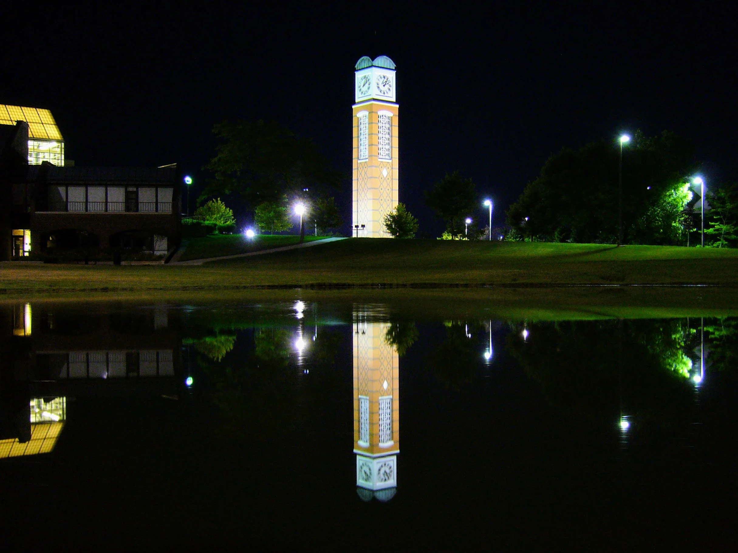 Back in July of 2007, my friend Anne and I would stay up late and walk from her off-campus apartment to campus and wander around. We were creatures of the night who didn't sleep, loved to observe the night happenings, and needed the exercise. I had just purchased a new point and shoot camera, a Panasonic DMC-FX3 to be exact, and was taking hundreds of photos every week just because I could. I had never had a digital camera before, and this was before smartphones, so it was an exciting new toy for me. On one of our many walks to campus at night, I decided to use the "long exposure" setting on the camera and take some photos around campus. The range of exposure varied between 15 and 60 seconds. I edited them, only slightly, mainly to straighten them out as they were taken by being propped up on something because I didn't own a tripod. I adjusted the brightness on some, but didn't do too much else to enhance them at all.
